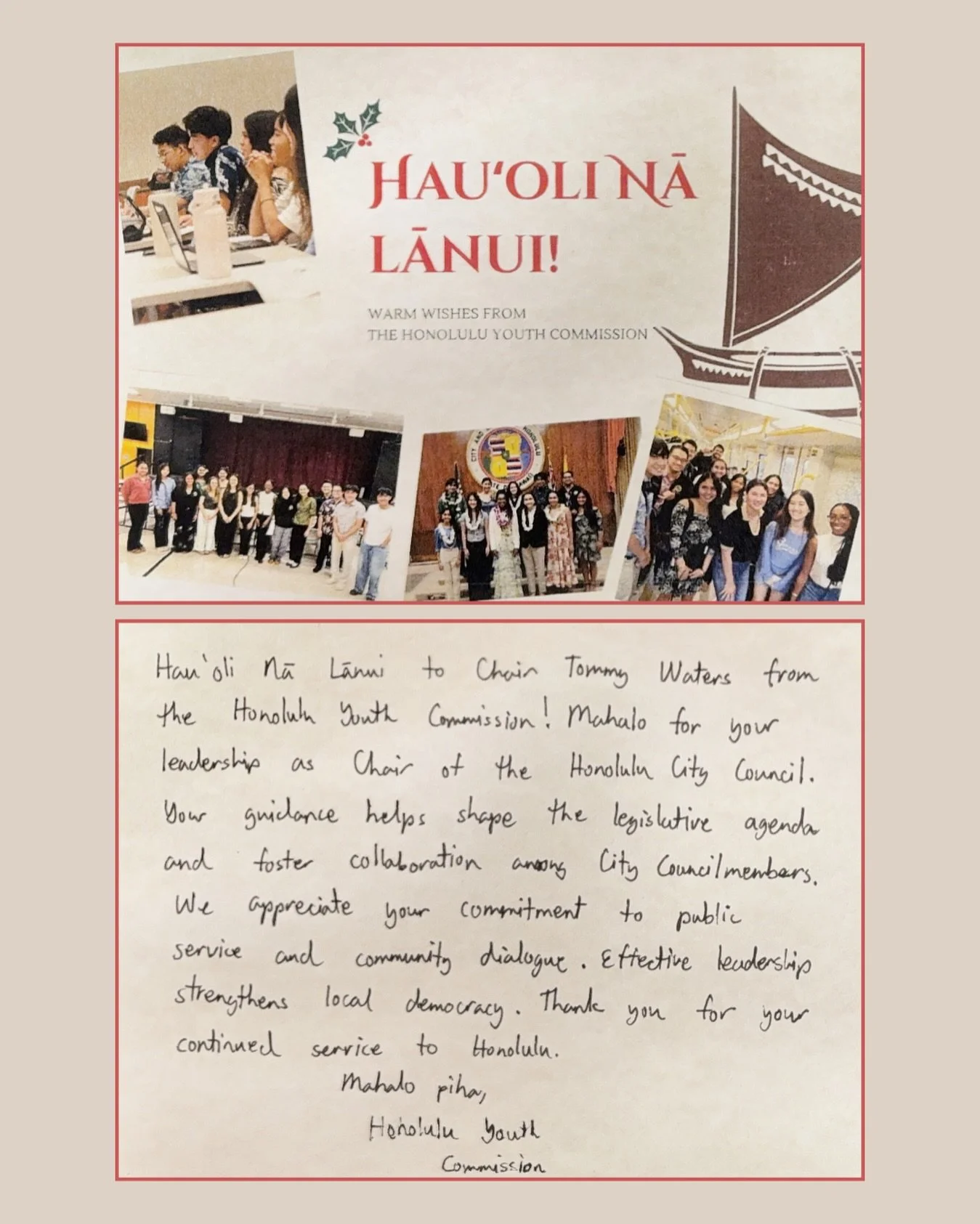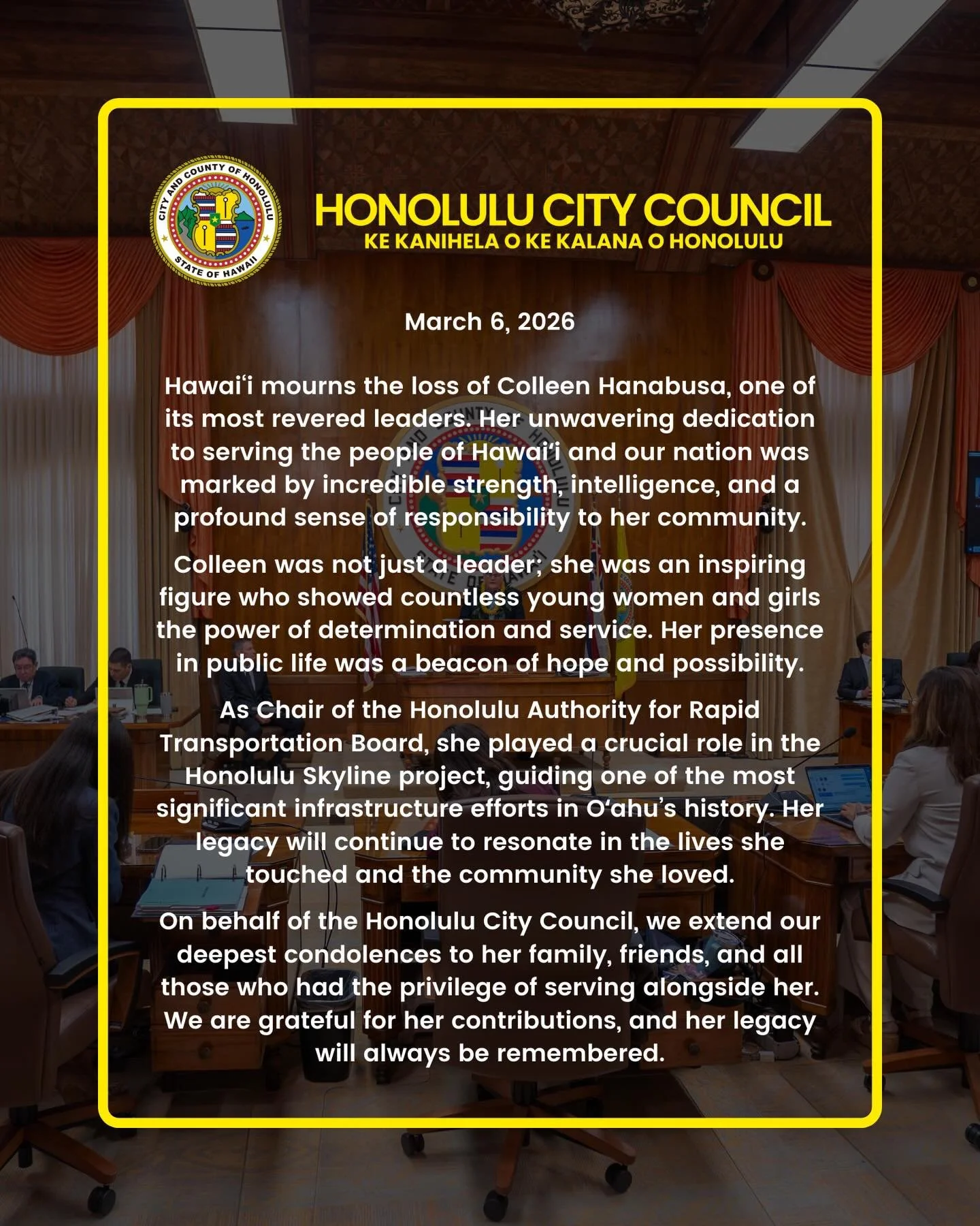The Honolulu City Council is responsible for serving and advancing the general welfare, health, happiness, and safety of the land and our communities.